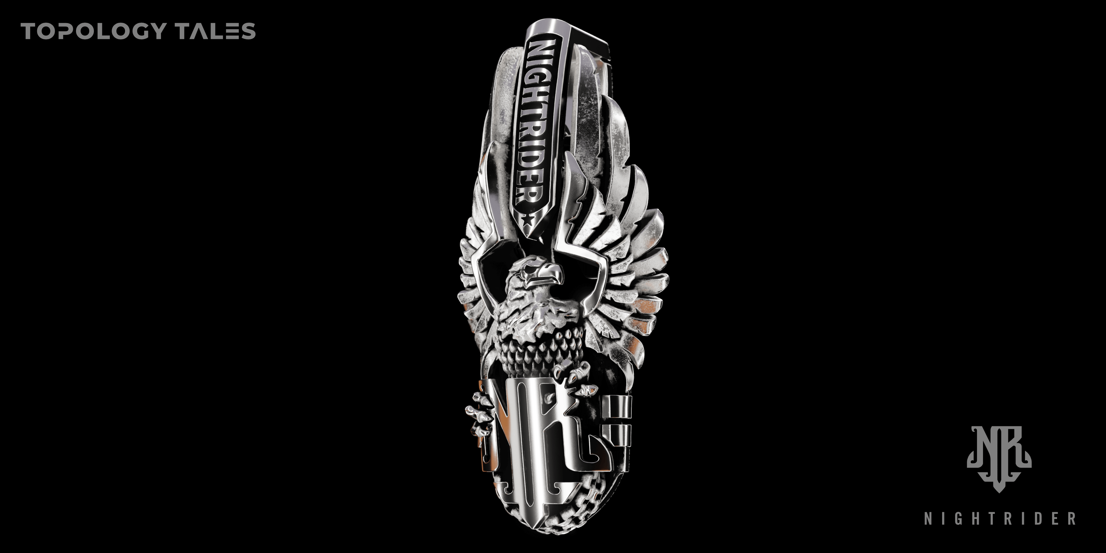 To translate the essence of this NightRider piece into a digital experience, the Topology Tales studio developed a highly precise 3D model supported by ultra detailed textures that bring each sculpted feature to life. After collaborating closely with our client to refine the artistic direction, we produced photorealistic 3D renders and cinematic animation that highlight the pendant’s form, weight, and symbolic detail with clarity and impact.